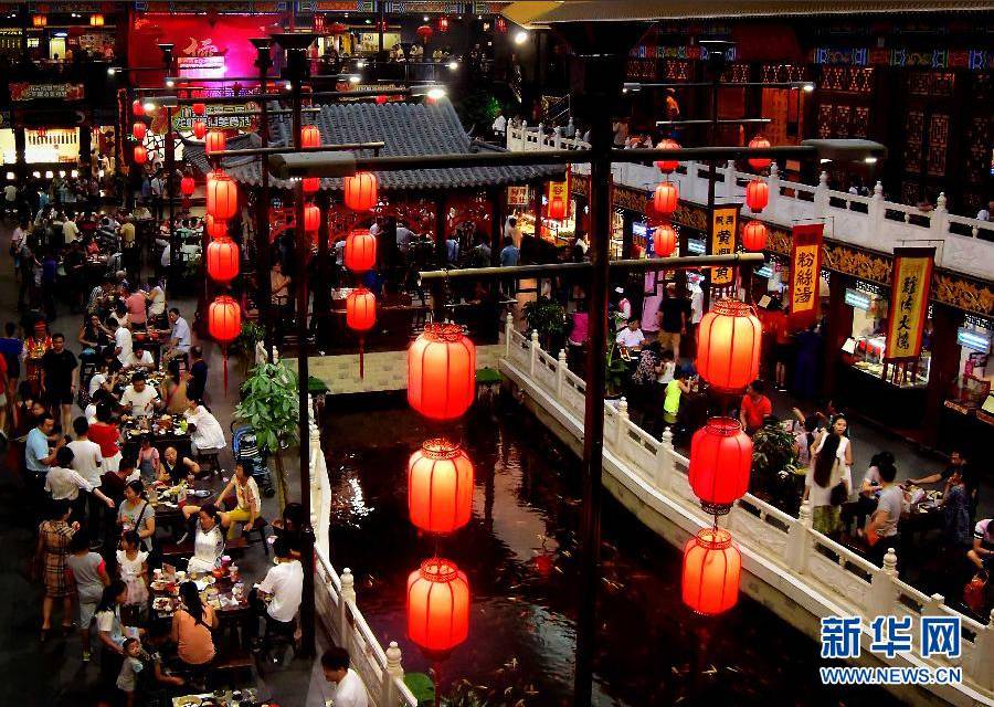Tourists enjoy snack food at a night market in Kaifeng, Henan, July 25, 2015. (Xinhua/Wang Song)