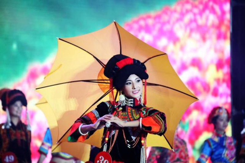 An annual traditional beauty pageant is held during the seventh international Liangshan Yi Torch Festival in Sichuan’s Yi Autonomous Prefecture on Aug. 9, 2015. Women in traditional Yi costumes performed singing and dancing at the event. (CNS/Gao Han)