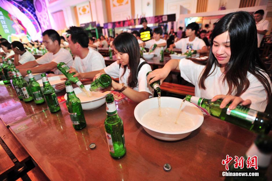 A beer drinking contest is held in Wuhan, central China's Hubei province on Aug. 9. A participant finished a big bowl of beer in 2 minutes. (CNS/Zhong Xin)