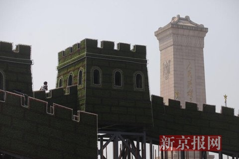 Great Wall-shaped flower terrace installed in Tiananmen Square for parade