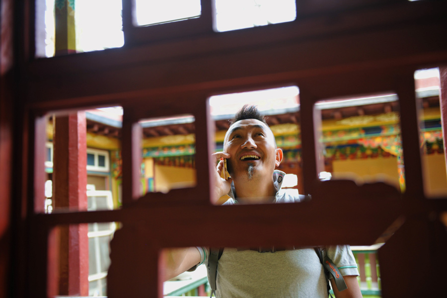 Lobsang Tashi receives a phone call at an ancient house being refurbished on Aug.6, 2015. (Photo/Xinhua)