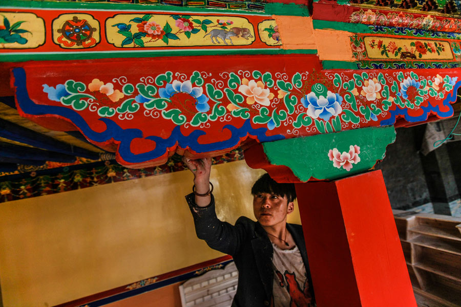 A painter draws pictures on the beam of Lobsang Tashi’s new hotel on Aug. 5, 2015. (Photo/Xinhua)