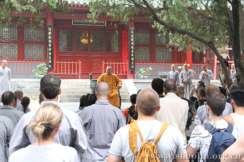 More than 20 foreigners from all over the world pay homage to Shaolin temple in Central China's Henan Province on Aug. 11. Shi Yongxing, the abbot of the Shaolin Temple received them. (Photo/Shaolin.org.cn)