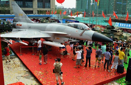 A J-10 aircraft on display at the Shanghai National Defense Weapons Expo, Aug. 23, 2014. (Photo/Xinhua)