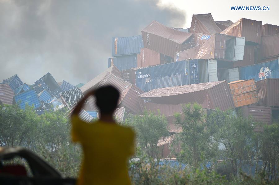 Damaged shipping containers are seen near the site of the explosions at the Binhai new district in north China's Tianjin Municipality, Aug. 13, 2015. The death toll has climbed to 44 from two massive blasts that ripped through a warehouse in north China's port city of Tianjin as of Thursday noon, according to rescue headquarters. Twelve firefighters were among the dead. (Xinhua)