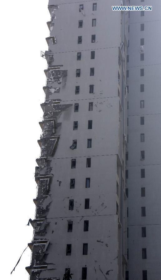 Photo taken on Aug. 13, 2015 shows a damaged residential building near the explosive site in Binhai New Area of Tianjin, north China. The death toll has climbed to 44 from two massive blasts that ripped through a warehouse in north China's port city of Tianjin as of Thursday noon, according to rescue headquarters. Twelve firefighters were among the dead. (Xinhua/Yue Yuewei)