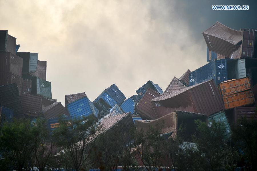 Makeshift dormitories of a construction company collapsed near the explosive site in Binhai New Area of Tianjin, north China, Aug. 13, 2015. The death toll has climbed to 44 from two massive blasts that ripped through a warehouse in north China's port city of Tianjin as of Thursday noon, according to rescue headquarters. Twelve firefighters were among the dead. (Xinhua)