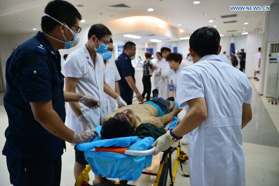 A man injured in the explosion of the Binhai new district is sent to the Tianjin Taida Hospital in north China's Tianjin Municipality, Aug. 13, 2015. The death toll has climbed to 44 from two massive blasts that ripped through a warehouse in north China's port city of Tianjin as of Thursday noon, according to rescue headquarters. Twelve firefighters were among the dead. (Xinhua)