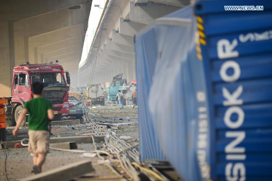 Vehicles are damaged under a bridge near the explosive site in Binhai New Area of Tianjin, north China, Aug. 13, 2015. The death toll has climbed to 44 from two massive blasts that ripped through a warehouse in north China's port city of Tianjin as of Thursday noon, according to rescue headquarters. Twelve firefighters were among the dead. (Xinhua)