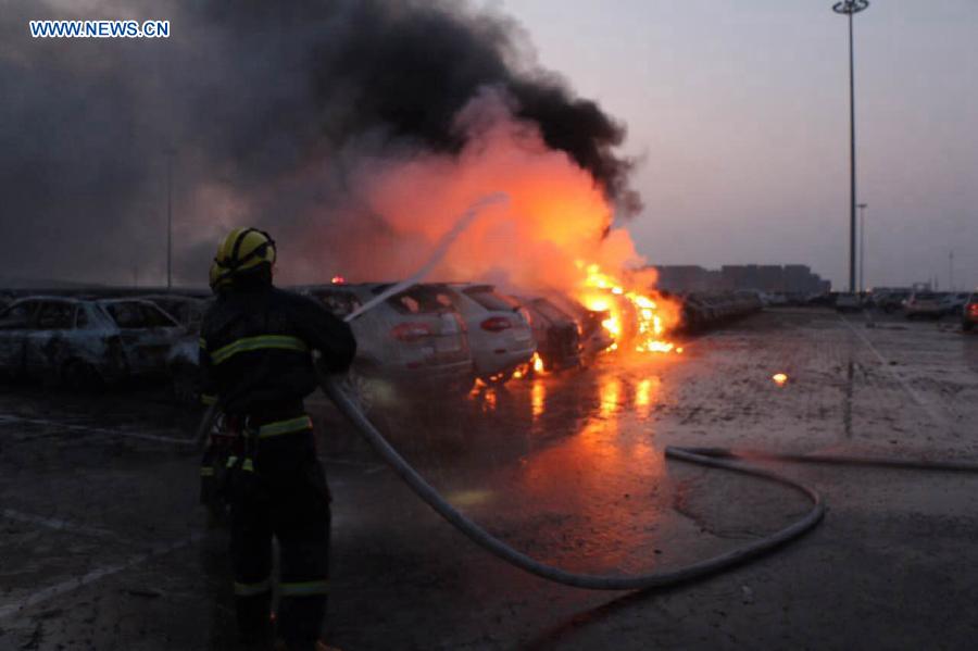 A fire fighter puts out fire on cars affected by the explosion in the Binhai New Area in north China's Tianjin Municipality, Aug. 13, 2015. The death toll from a Tianjin warehouse blast Wednesday night has climbed to 17, according to rescuers. Another 32 people were critically injured and 283 people are under observation in hospital. (Xinhua)