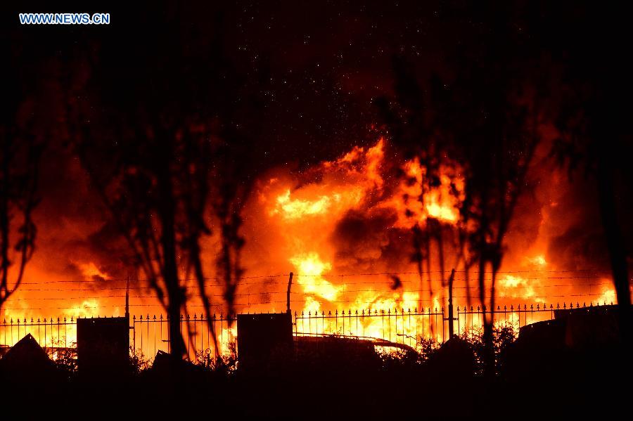 Photo taken on Aug. 13, 2015 shows the burning scene of the explosion site in the Binhai New Area in north China's Tianjin Municipality. The death toll from a Tianjin warehouse blast Wednesday night has climbed to 17, according to rescuers. Another 32 people were critically injured and 283 people are under observation in hospital. (Xinhua)