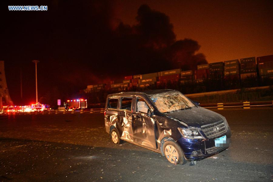 A car is damaged in the explosion in the Binhai New Area in north China's Tianjin Municipality, Aug.13, 2015. The death toll from a Tianjin warehouse blast Wednesday night has climbed to 17, according to rescuers. Another 32 people were critically injured and 283 people are under observation in hospital. (Xinhua)
