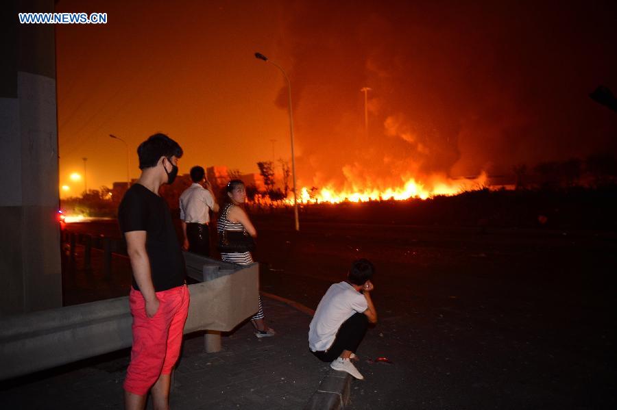 People watch the fire at the explosion site in the Binhai New Area in north China's Tianjin Municipality, Aug.13, 2015. The death toll from a Tianjin warehouse blast Wednesday night has climbed to 17, according to rescuers. Another 32 people were critically injured and 283 people are under observation in hospital. (Xinhua)