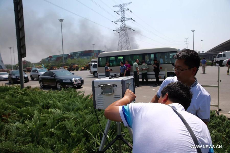 Staff members of Tianjin Environment Monitoring Center monitors air quality near the explosion site in Binhai New Area of Tianjin, north China, Aug. 13, 2015. The death toll has climbed to 44 from two massive blasts that ripped through a warehouse in north China's port city of Tianjin as of Thursday noon, according to rescue headquarters. Twelve firefighters were among the dead. (Xinhua/Jin Liwang)