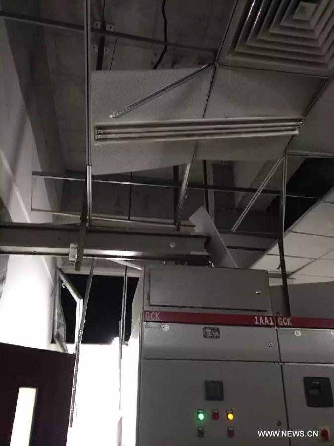 Photo taken on Aug. 13, 2015 shows the damaged building near the site of the explosions in the Binhai New Area in north China's Tianjin Municipality. A series of explosions at a warehouse for dangerous goods in north China's Tianjin Municipality killed at least 17 people. Another 32 people were critically injured and 283 people are under observation in hospital. (Xinhua/Yue Yuewei)