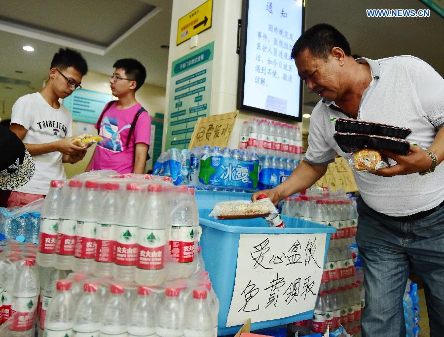 Volunteers set up a supply site at the hospital, providing free water and food in Tianjin, north China, Aug. 13, 2015. The death toll has climbed to 44 from two massive blasts that ripped through a warehouse in north China's port city of Tianjin as of Thursday noon, according to rescue headquarters. Twelve firefighters were among the dead. (Xinhua/Zhang Chenlin)