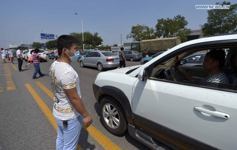 | Volunteers guide cars at the allocation site for people injured in the explosion of the Binhai new district in north China's Tianjin Municipality, Aug. 13, 2015. The death toll rose to 44, including 12 firefighters, from massive warehouse blasts in the northern Chinese port of Tianjin as firefighters continue to battle flames still blazing at the blast site. A total of 520 people have been hospitalized, including 66 critically injured, according to the rescue headquarters. (Xinhua/Yue Yuewei) |