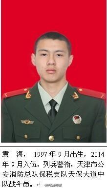 18-year-old firefighter Yuan Hai was killed in the massive explosion in Tianjin on Wednesday night. He joined the army in September 2014. (Photo from Weibo)