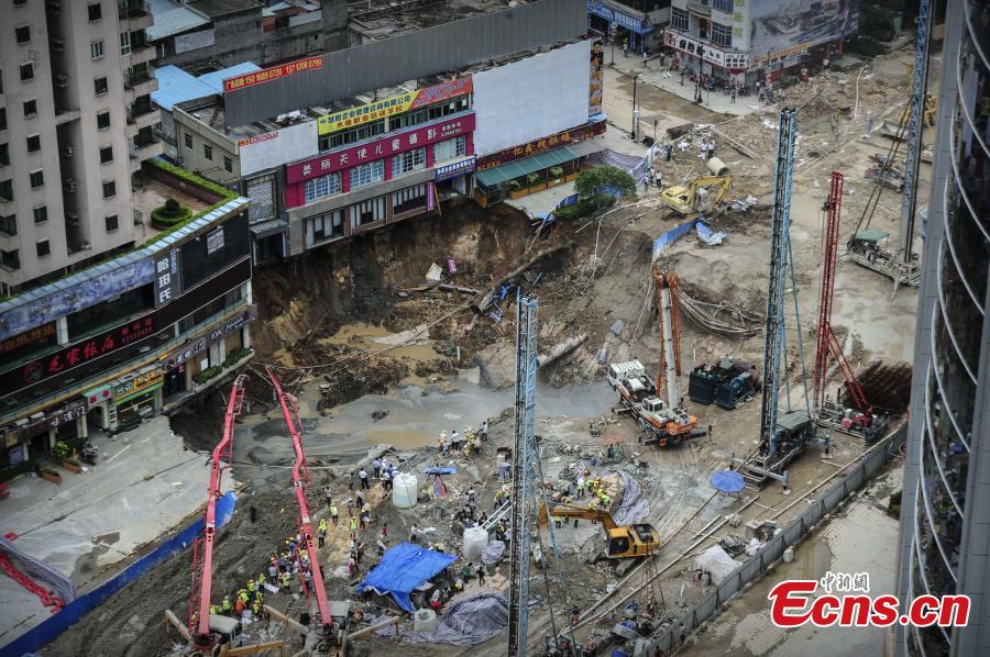 Workers fill a cave-in with cement at a subway construction site in Dongguan city, South China’s Guangdong province, Aug 13, 2015. One worker died after a 300-square-meter area collapsed at the site. A car was also swallowed into the hole during the collapse on Wednesday. The accident also caused water and gas pipelines to burst. (Photo: China News Service/Chen Jimin)