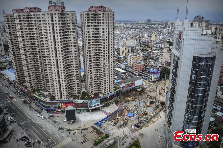 Workers fill a cave-in with cement at a subway construction site in Dongguan city, South China’s Guangdong province, Aug 13, 2015. One worker died after a 300-square-meter area collapsed at the site. A car was also swallowed into the hole during the collapse on Wednesday. The accident also caused water and gas pipelines to burst. (Photo: China News Service/Chen Jimin)