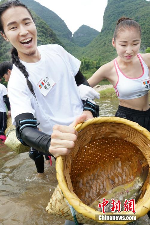 | Contestants from 10 Asian countries taking part in the final of Asian Super Model Contest attend an interesting “fish catching contest” in Guilin, south China’s Guangxi on Aug. 12, 2015. (CNS/Luo Wengang) |