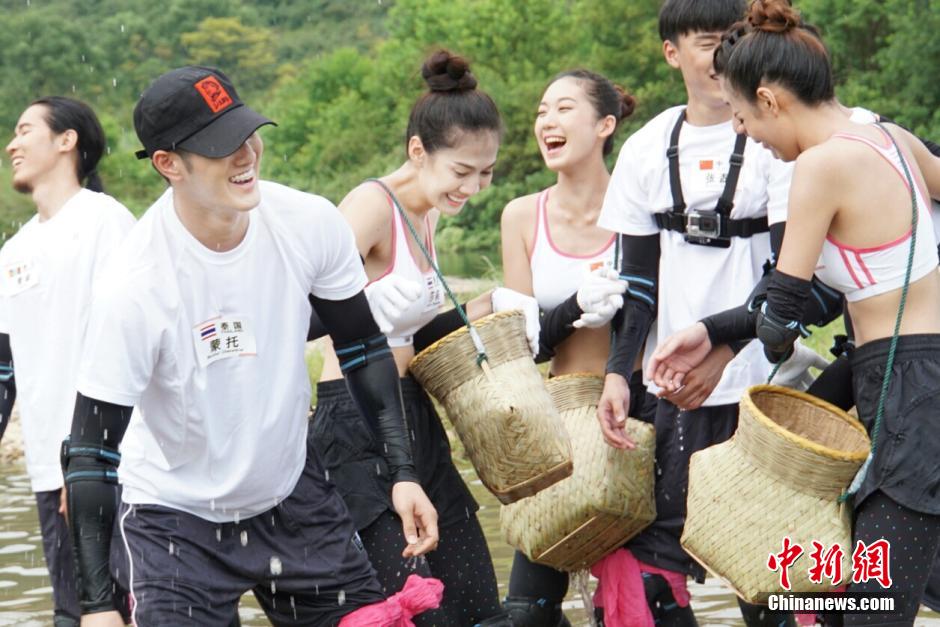 Contestants from 10 Asian countries taking part in the final of Asian Super Model Contest attend an interesting “fish catching contest” in Guilin, south China’s Guangxi on Aug. 12, 2015. (CNS/Luo Wengang)