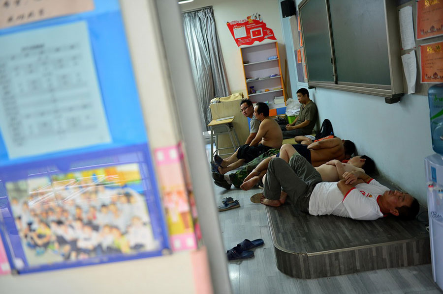 Nearby residents have a rest in the classroom of the No. 2 primary school in Tianjin Development Zone on Aug. 13, 2015. (Photo/Xinhua)