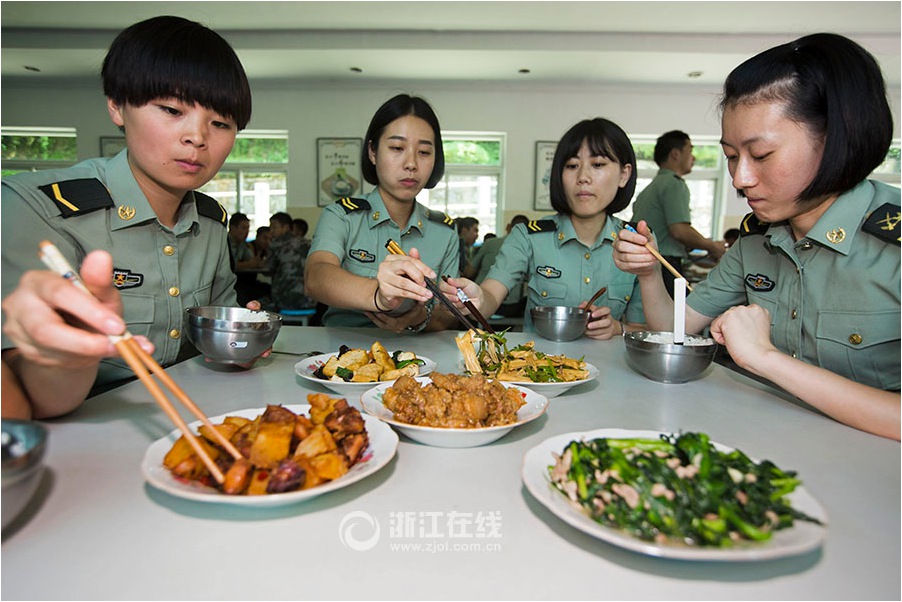 The soldiers have lunch at the cafeteria. (Zhejiang Online/Tong Xiaolei)