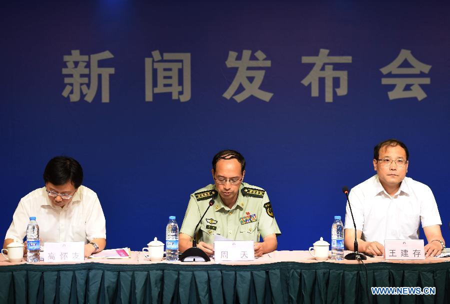 Tianjin's fire department head Zhou Tian (C) speaks during a press conference on the explosion of Wednesday night in north China's Tianjin Aug. 14, 2015. The air and water quality in the blasts area in north China's Tianjin is being closely monitored, as on-site conditions are still unclear. (Xinhua/Zhang Chenlin)