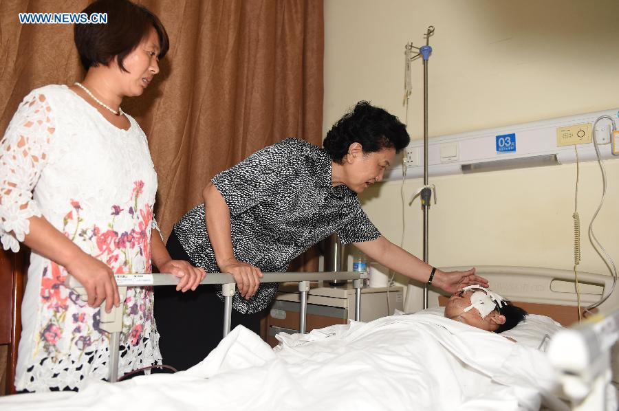 | Chinese Vice Premier Liu Yandong visits injured people at Binhai No. 5 Central Hospital in Tianjin, north China, Aug. 13, 2015. Commissioned by President Xi Jinping and Premier Li Keqiang, Liu on Thursday visited two hospitals where injured firefighters and residents were treated. An explosion, which occurred Wednesday night at a warehouse in Binhai, has left 50 people dead and 701 others injured. (Xinhua/Zhang Chenlin) |