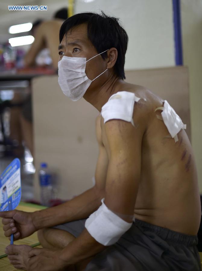 An injured rests at a temporary shelter in No. 2 Elementary School of the Binhai New District Development Zone in Tianjin, north China, Aug. 13, 2015. An explosion, which occurred Wednesday night at a warehouse in Binhai, has left 50 people dead and 701 others injured. (Xinhua/Yue Yuewei)