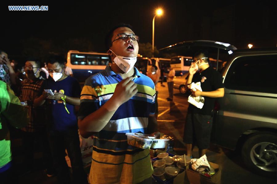 A volunteer distributes box meals to people living at a temporary shelter in No. 2 Elementary School of the Binhai New District Development Zone in Tianjin, north China, Aug. 13, 2015. An explosion, which occurred Wednesday night at a warehouse in Binhai, has left 50 people dead and 701 others injured. (Xinhua/Cai Yang)