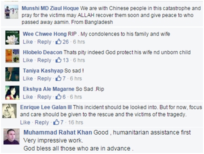 Munshi MD Ziaul Hoque from Bangladesh comments on Facebook: "We are with Chinese people in this catastrophe and pray for the victims." People are shocked and feel sad for the tragedy in China. Another comment from Pakistan says, "I am very sad and shocked to see this. God bless the families of victims and dead rest in Peace.