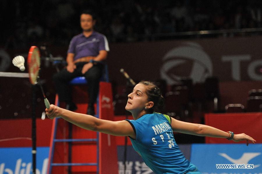 Carolina Marin of Spain returns the shuttlecock to Wang Shixian of China during her women's singles quarterfinal match at the BWF World Championships 2015 in Jakarta, Indonesia, Aug. 14, 2015. Carolina Marin won 2-0. (Xinhua/Veri Sanovri)