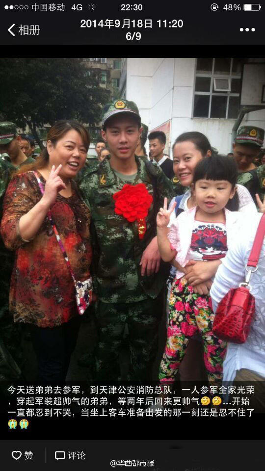 Yuan Hai and his family on the day he joined the army. (Photo from Weibo)