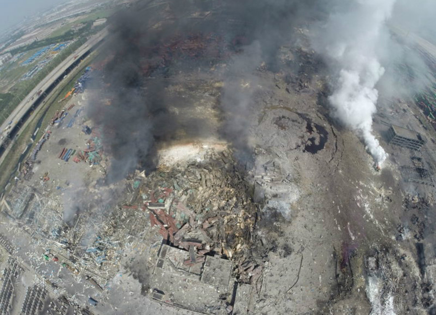 At 11 p.m. on Aug. 12, explosions occurred in a warehouse of Ruihai Company in the International Logistics Center in Tianjin. As of Aug. 14, at least 50 people, including 12 firefighters, had died and more than 500 had been injured. The photo is taken after the explosions. (Photo from The Beijing News)