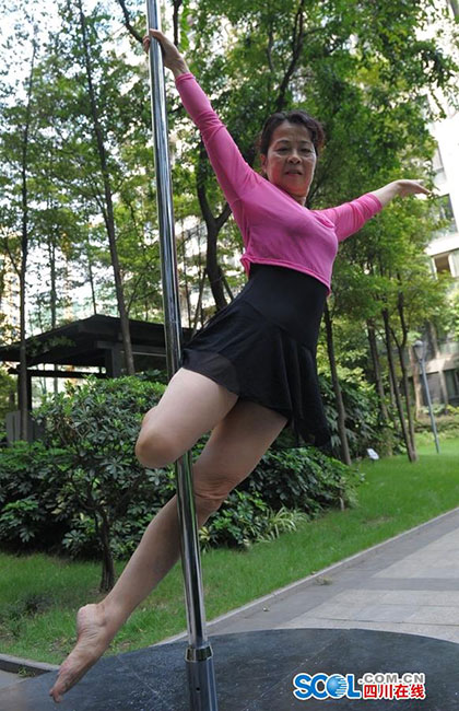 Dai Dali, 70, practices pole dancing in Chengdu city, capital of southwest China's Sichuan province. (Photo/ scol.com.cn)