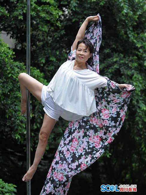 Dai Dali, 70, practices pole dancing in Chengdu city, capital of southwest China's Sichuan province. (Photo/ scol.com.cn)