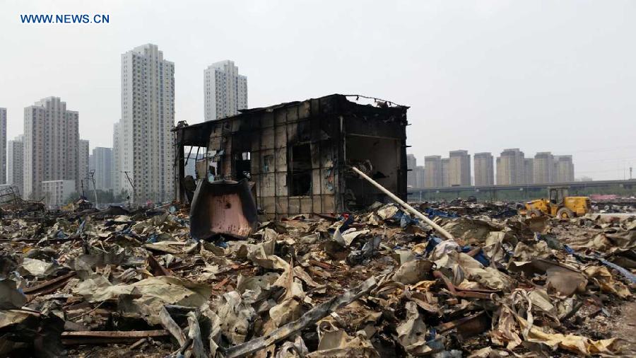 Photo taken on Aug. 14, 2015 shows a big mess near the core area of explosion site in Tianjin, north China. Death toll rose to 85 as of Friday night, including 21 firemen, from the massive warehouse explosions hitting north China's Tianjin City Wednesday night, the rescue headquarters said Saturday. Meanwhile, 721 others were hospitalized, including 25 critically wounded and 33 in serious condition. (Xinhua/Yang Weicheng)