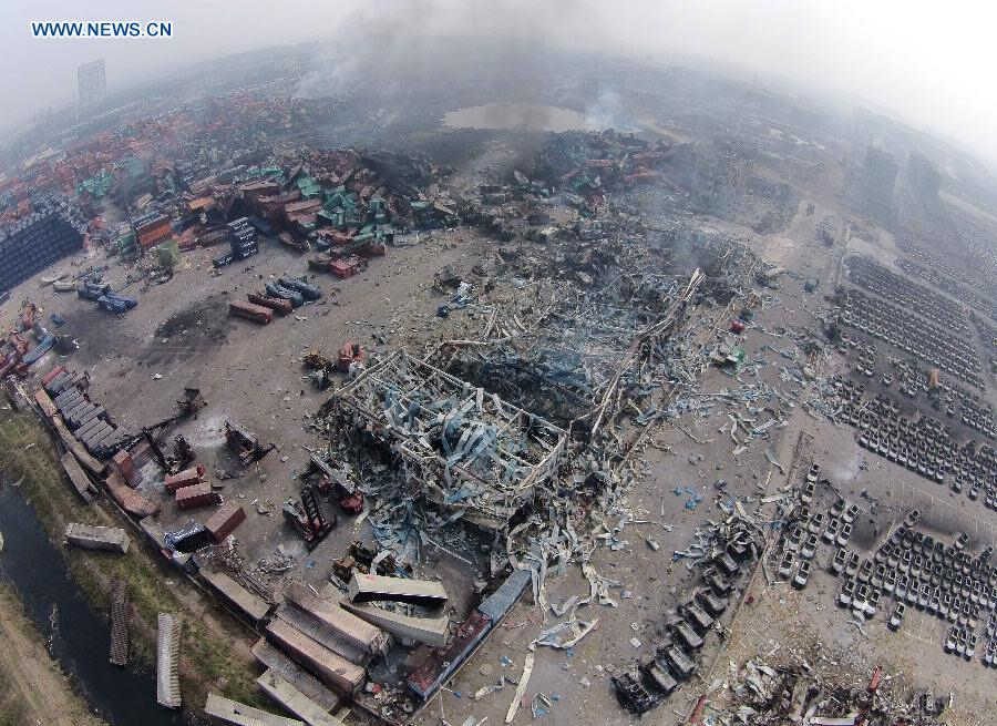 Photo taken on Aug. 15, 2015 shows black smoke emitting from the core area of explosion site in Tianjin, north China. Death toll rose to 85 as of Friday night, including 21 firemen, from the massive warehouse explosions hitting north China's Tianjin City Wednesday night, the rescue headquarters said Saturday. Meanwhile, 721 others were hospitalized, including 25 critically wounded and 33 in serious condition. (Xinhua/Yue Yuewei)