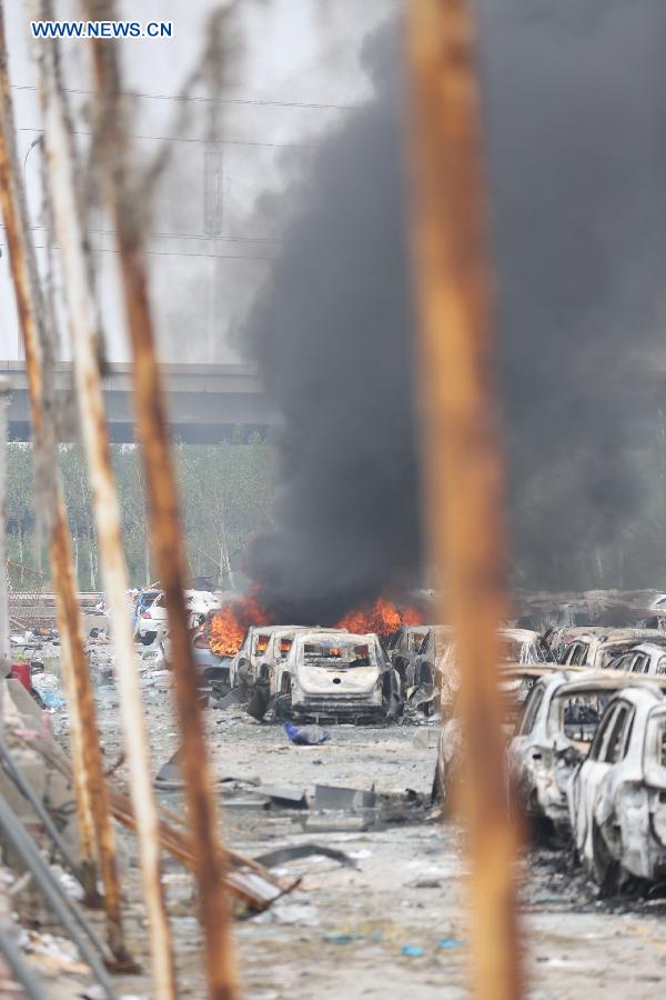Damaged cars explose and trigger new blasts at the site of explosion in Tianjin, north China, Aug. 15, 2015. Death toll rose to 85 as of Friday night, including 21 firemen, from the massive warehouse explosions hitting north China's Tianjin City Wednesday night, the rescue headquarters said Saturday. Meanwhile, 721 others were hospitalized, including 25 critically wounded and 33 in serious condition. (Xinhua/Jin Liwang)