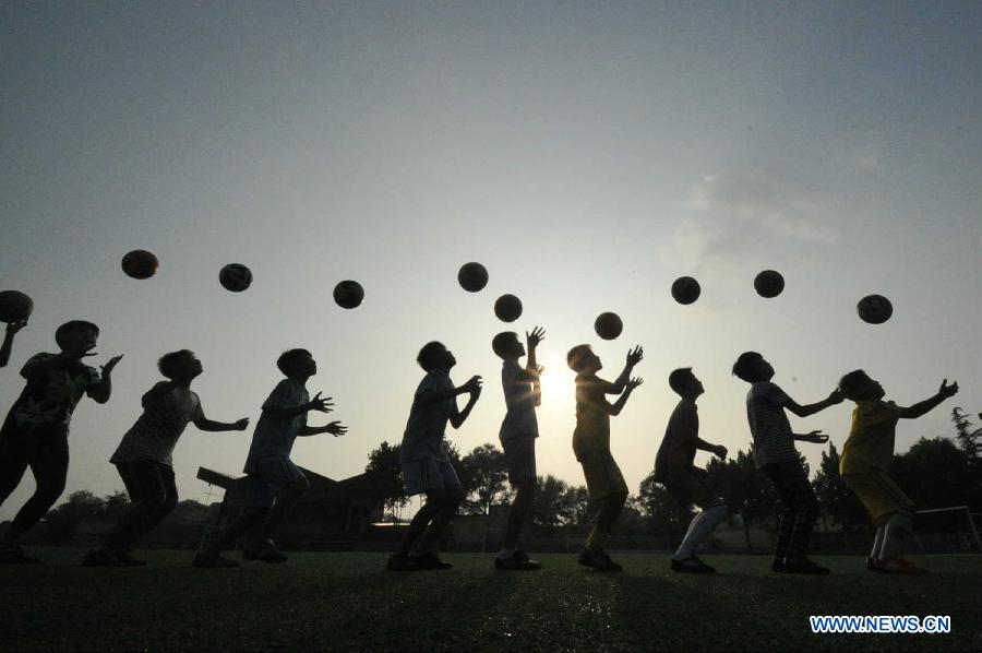 Members of a soccer team of Xijie Experimental Elementary School receive training in Xinjiang County of Yuncheng City, north China's Shanxi Province, Aug. 14, 2015. (Xinhua/Gao Xinsheng)