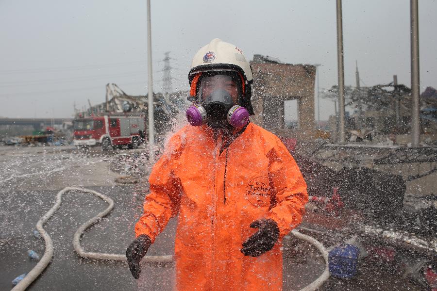 A firefighter wearing chemical protective clothing is sterilized at the site of explosion in Tianjin, north China, Aug. 15, 2015. Death toll rose to 85 as of Friday night, including 21 firemen, from the massive warehouse explosions hitting north China's Tianjin City Wednesday night, the rescue headquarters said Saturday. Meanwhile, 721 others were hospitalized, including 25 critically wounded and 33 in serious condition. (Xinhua/Jin Liwang)