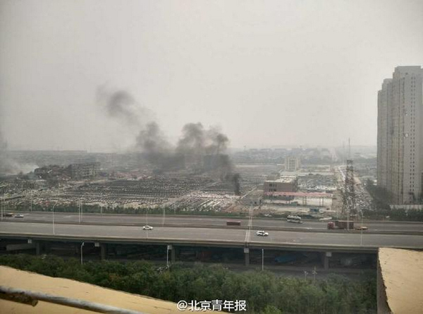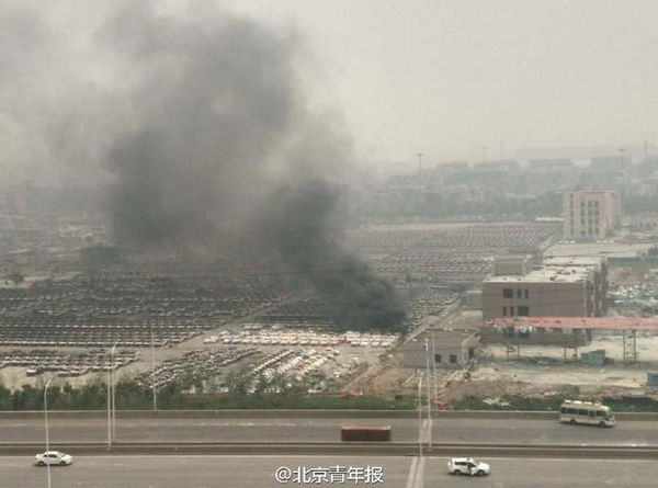 Flames were seen at 11:40 a.m., and Xinhua reporters heard several blasts. Dense smoke could be seen at the site.