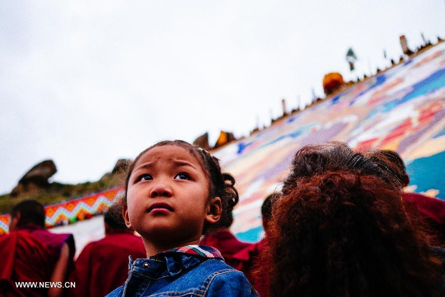 A child is seen at the ceremony of unfolding a huge Thangka Buddha portrait at Drepung Monastery in Lhasa, capital of southwest China's Tibet Autonomous Region, Aug. 14, 2015. More than 200,000 Buddhists and other believers on Friday thronged Lhasa for the start of the traditional Shoton Festival. The Shoton Festival, also known as the Yogurt Banquet Festival, is a week-long gala held since the 11th century. [Photo: Xinhua/Liu Jinhai]