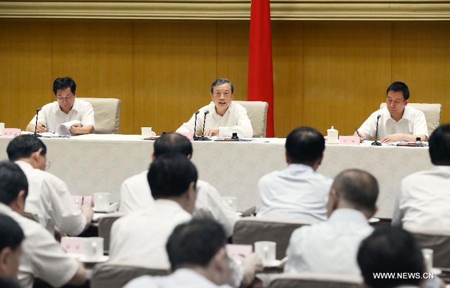 Chinese Vice Premier Ma Kai (C, back) attends a national teleconference of the State Council on work safety in Beijing, capital of China, Aug. 15, 2015. (Xinhua/Yao Dawei)
