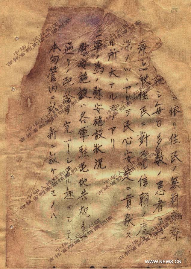 BEIJING, Aug. 16 -- A series of historical reports and personal letters, published by China's State Archives Administration on Sunday, has presented new evidence about the Imperial Japanese Army's war crimes in enslavement of "comfort women."
