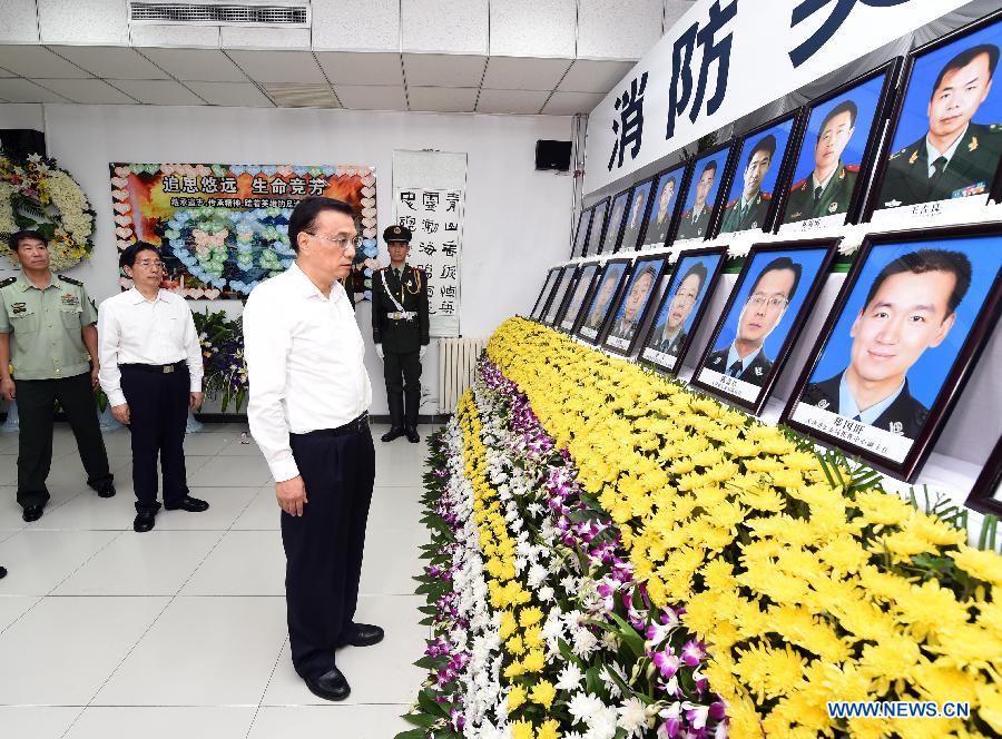 Chinese Premier Li Keqiang (front) pays respects to firefighters who lost their lives in the massive warehouse blasts in Tianjin, north China, Aug. 16, 2015. Li visited fire fighters, rescuers and those injured in the calamity. Li also directed further rescue operations and treatment of the injured, as well as handling of the aftermath and production safety. (Xinhua/Zhang Duo)