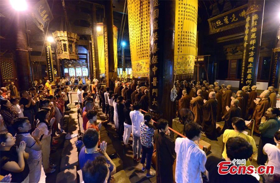 Monks pray for the victims of the Tianjin explosions at Mount Putuo in East China’s Zhejiang province, Aug 15, 2015. More than 1,000 monks attended the prayer service at Mount Putuo, one of the four sacred mountains in Chinese Buddhism. (Photo: China News Service/Chang Qi)