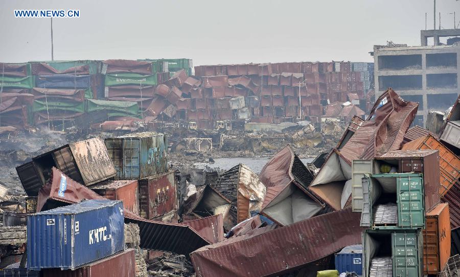 | Photo taken on Aug. 17, 2015 shows the warehouse explosion site in Tianjin. Death toll of the massive Tianjin blasts rose to 114 after rescuers found two more bodies in the debris, a municipal publicity official said on Monday. (Xinhua/Yue Yuewei) |